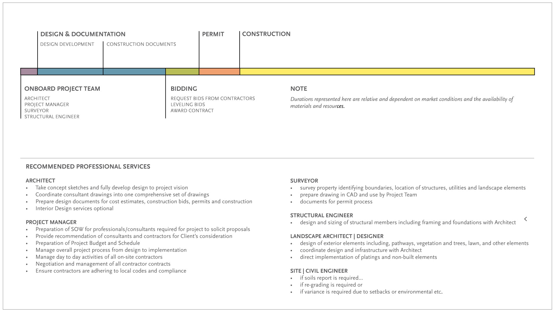 Based on the projects/phases outlined for each concept, rough order of magnitude cost estimates are developed based on current, regional construction data. These are not construction bids but a guide for project investment planning. A typical project workflow is outlined as well as recommended professional services.